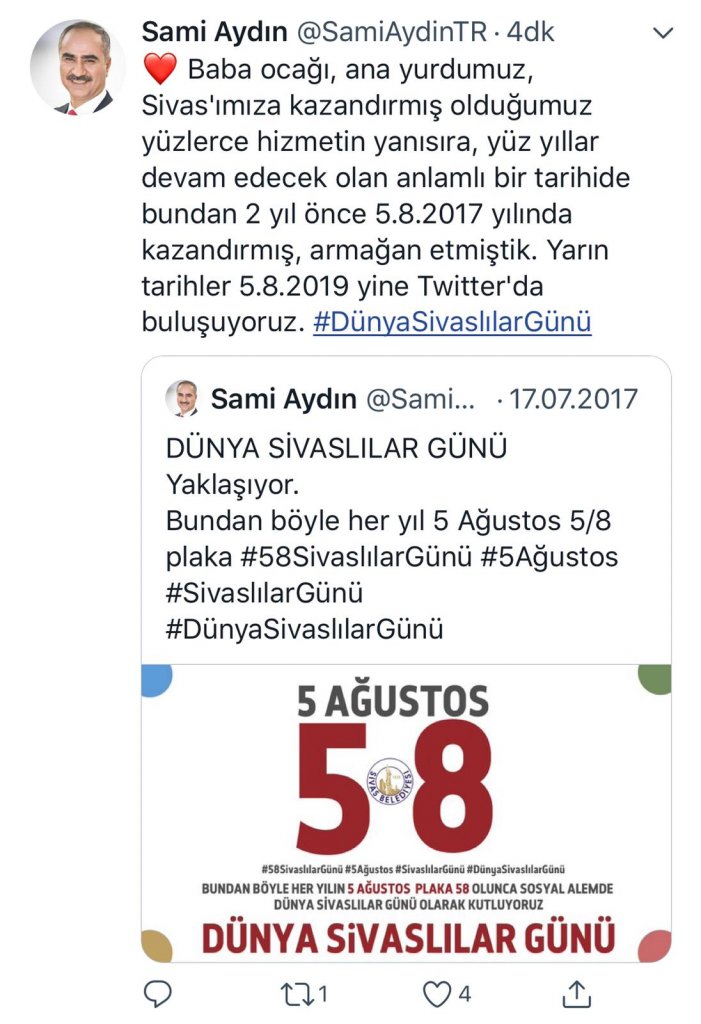2017 yılında attığı tweet ise şöyle : "DÜNYA SİVASLILAR GÜNÜ Yaklaşıyor. Bundan böyle her yıl 5 Ağustos 5/8 plaka #58SivaslılarGünü #5Ağustos #SivaslılarGünü #DünyaSivaslılarGünü"