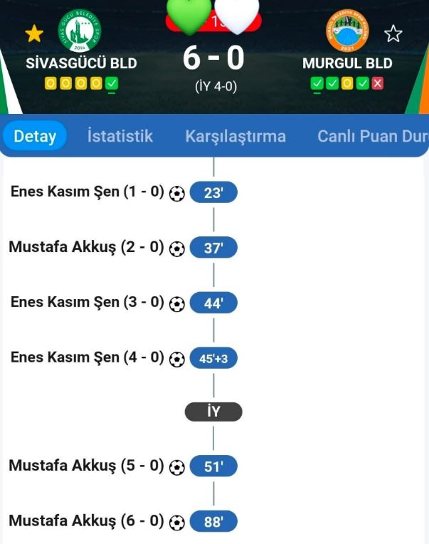 İkinci yarıya da etkili başlayan Sivas ekibi, 51. dakikada Mustafa Akkuş’un golüyle skoru 5-0 yaptı. 88. dakikada sahneye bir kez daha çıkan Mustafa Akkuş maçın skorunu tayin etti: 6-0.
