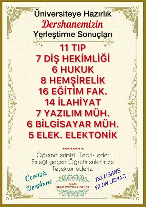 Halk Eğitim Merkezi'ndeki dersliklerde tamamen ÜCRETSİZ olarak verilen üniversiteye hazırlık kursunda her yıl üst düzeyde başarı elde edilirken geçtiğimiz yıl kursa ücretsiz olarak katılan öğrenciler 11 Tıp, 7 Diş Hekimliği, 6 Hukuk Fakültesi'nin yanı sıra çok sayıda mühendislik kazandı.