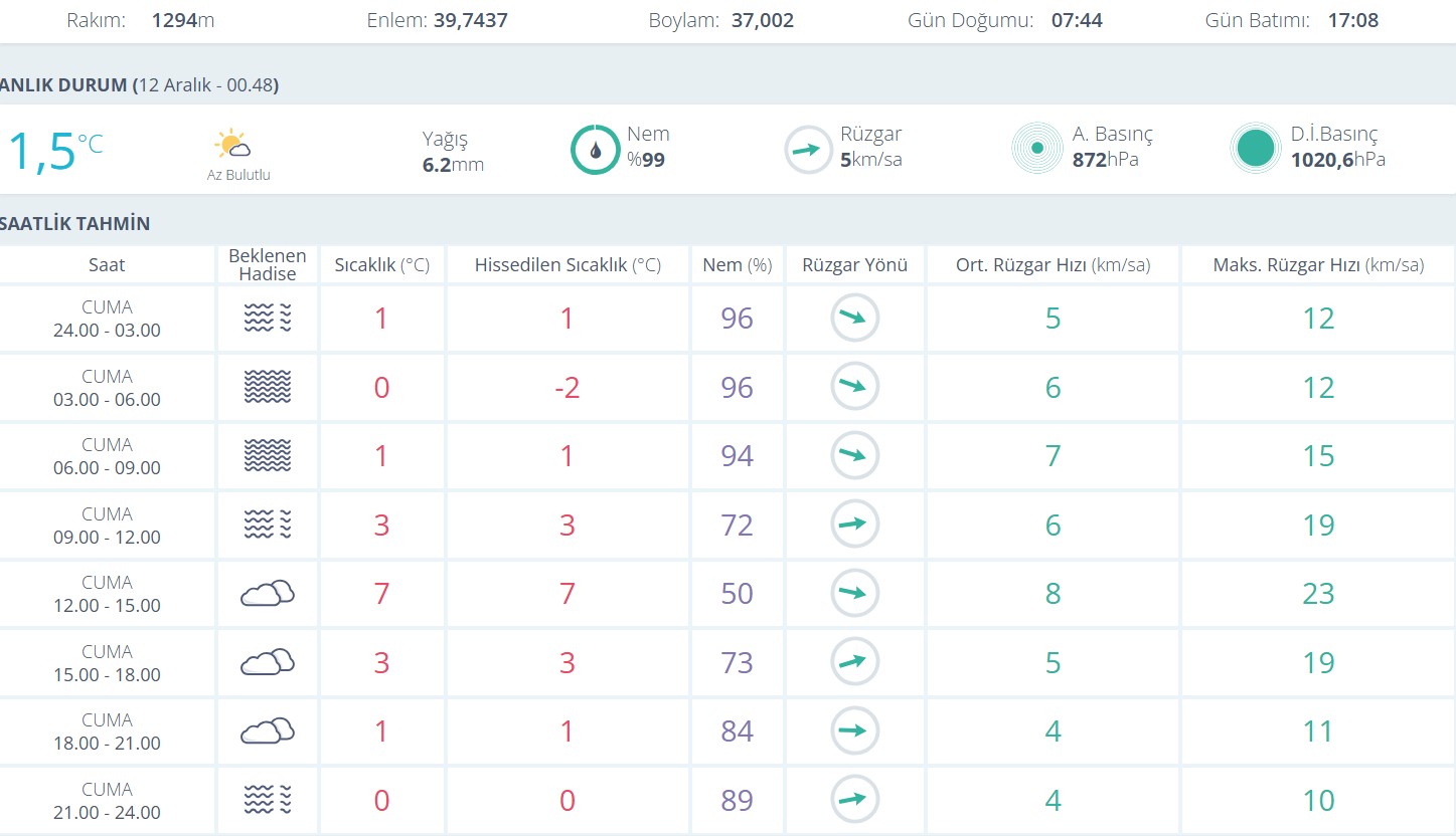 Sivas Hava Tahmin Raporu...Sivas'ta 12 Aralık 2025 tarihi için hava durumu tahmini açıklandı. Bu sabah saatlerinde 1,5°C sıcaklıkla başlayan gün, nem oranının %99 seviyelerine ulaşmasıyla soğuk bir hava ile başlıyor.