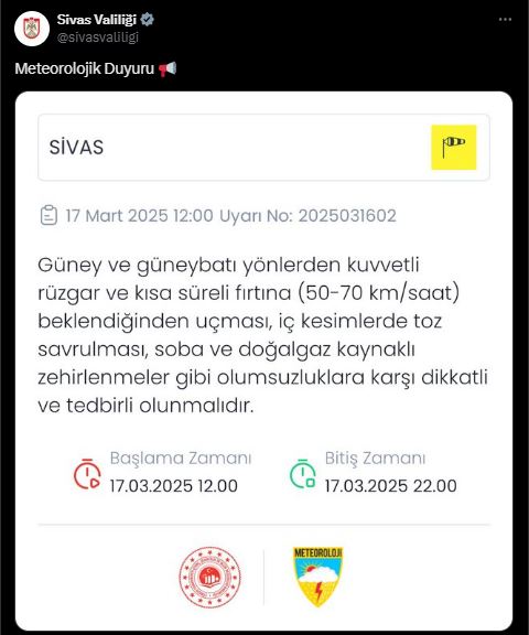 Uyarının başlama zamanı: 17 Mart 2025, 12:00