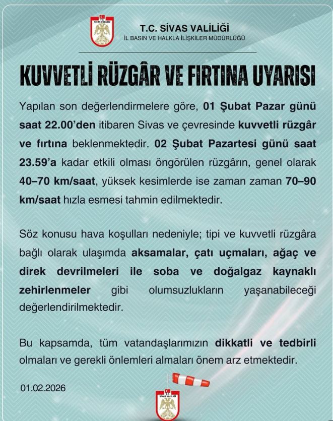 Sivas hava durumu, kuvvetli rüzgâr, fırtına uyarısı, Sivas Valiliği, ulaşımda aksamalar