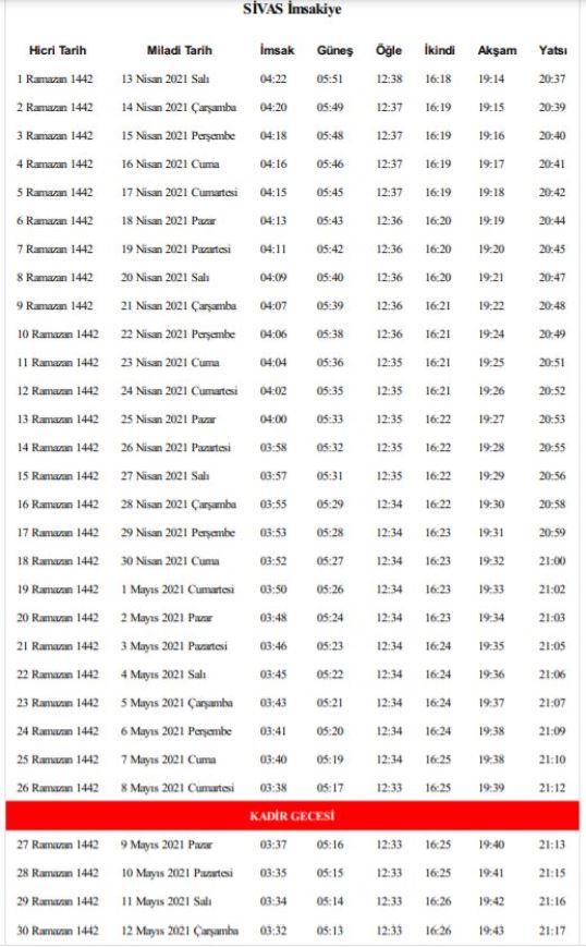 Diyanet İşleri Başkanlığı 81 ilin imsakiyesini yayınladı. Sivas imsakiye aşağıda yer alıyor. Ramazanın 26. günü 8 Mayıs Cumartesi günü Kadir Gecesi'ne denk geliyor. İşte Ramazanın ilk gününden son gününe kadar düzenlenmiş olan Sivas imsakiye detayları için okumaya devam edin. Sivas namaz vakitleri, iftar ve imsak vakti detayları...