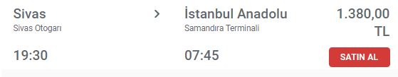 Bayramda Sivas-İstanbul şehirlerarası otobüs bileti alacak vatandaşlar 1200 TL yerinde 1380 TL ödemek zorunda kalacak..