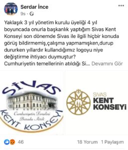 3 yıl öncesine kadar Başkanlığını Deva Partisi Sivas İl Başkanı Serdar İnce'nin yaptığı ve bugün Ahmet Alim başkanlığında idare edilen Sivas Kent Konseyi anlaşılamaz bir şekilde Kent Konseyi logosunda değişikliğe gitti.