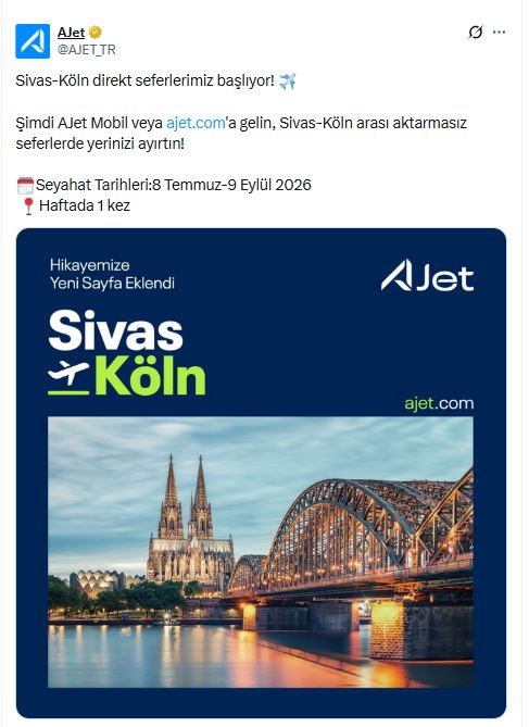 AJet tarafından planlanan Sivas-Köln direkt uçuşlarının 8 Temmuz – 9 Eylül 2026 tarihleri arasında gerçekleştirileceği duyuruldu. Haftada bir kez yapılacak seferler sayesinde özellikle yaz döneminde memleketlerine gelmek isteyen gurbetçiler için önemli bir ulaşım kolaylığı sağlanması hedefleniyor.