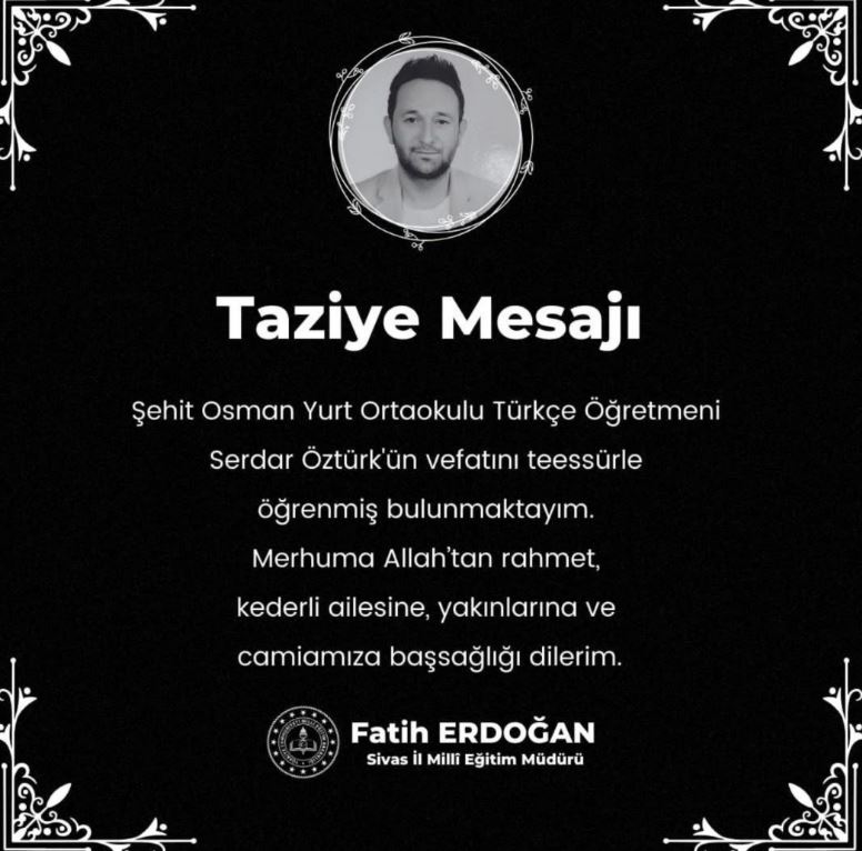 Sivas İl Milli Eğitim Müdürü Fatih Erdoğan da yayımladığı taziye mesajıyla acıyı paylaştı. Erdoğan mesajında, Serdar Öztürk’ün vefatını teessürle öğrendiğini belirterek, merhuma Allah’tan rahmet; kederli ailesine, yakınlarına ve eğitim camiasına başsağlığı dileklerini iletti.