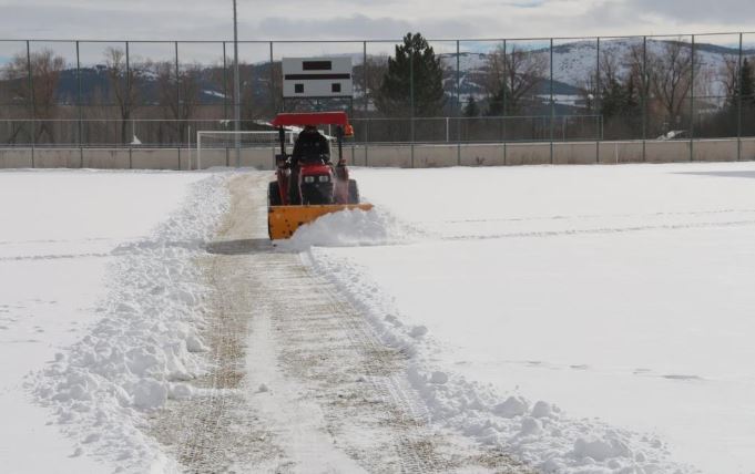 Sivas Belediyesi Spor İşleri Müdürlüğü saha bakım personeli, Gençlik ve Spor Hizmetleri İl Müdürlüğünün ekipman ve personelleri stadyumda kar temizleme çalışmasına başladı.