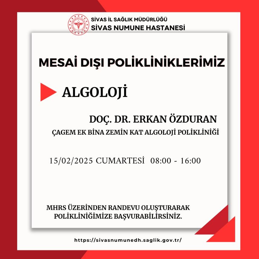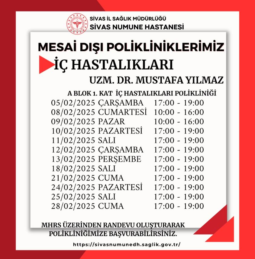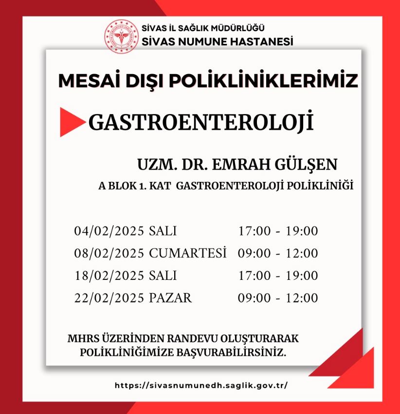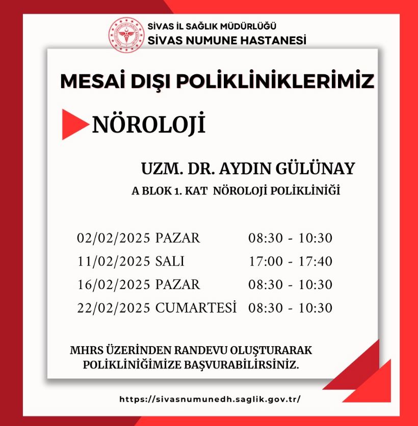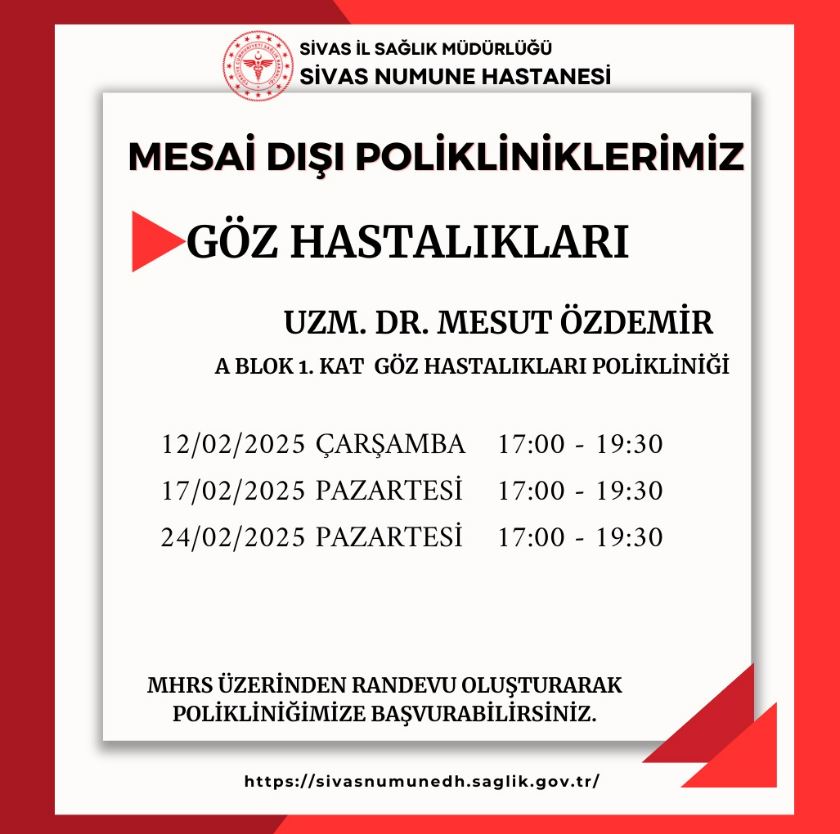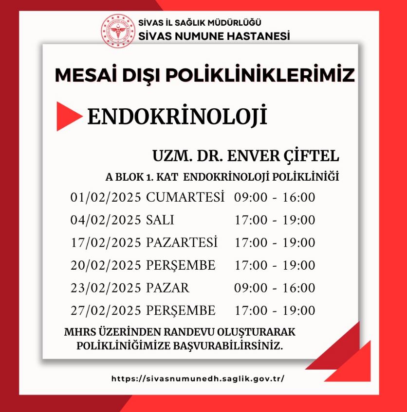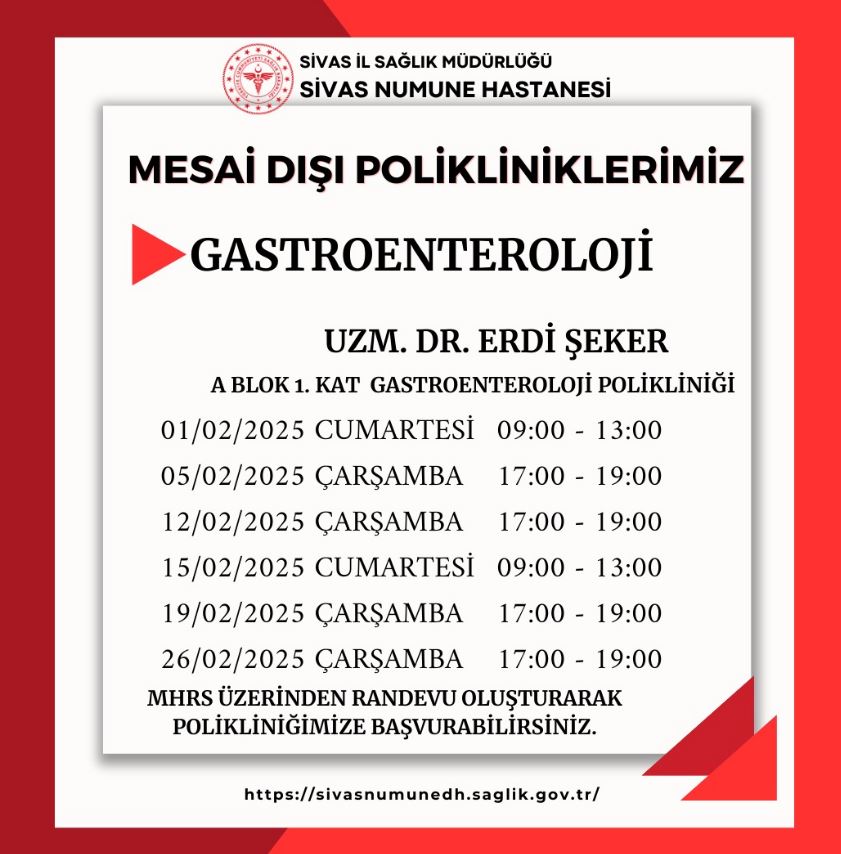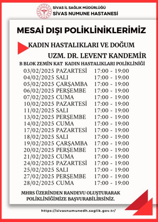 Sivas Numune Hastanesi, Şubat ayı mesai dışı poliklinik programını duyurdu.