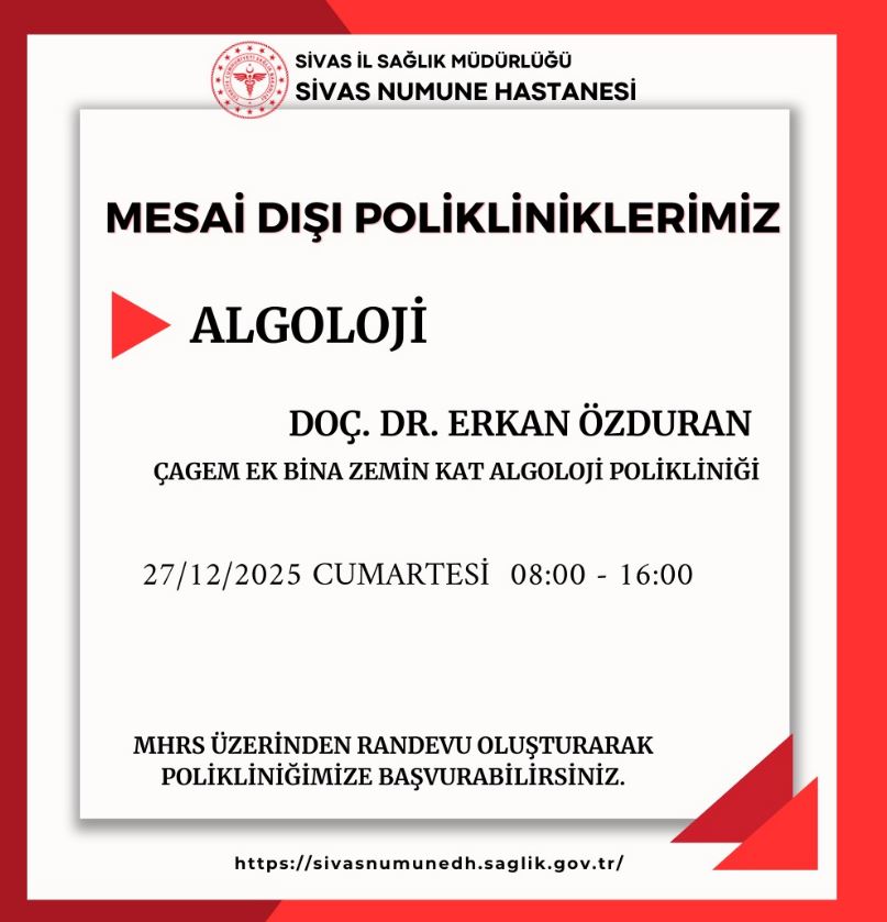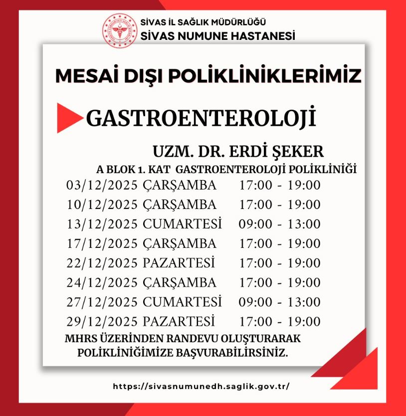 Sivas Numune Hastanesi, vatandaşların sağlık hizmetlerine daha kolay ulaşabilmesi amacıyla Aralık 2025 mesai dışı poliklinik programını duyurdu.