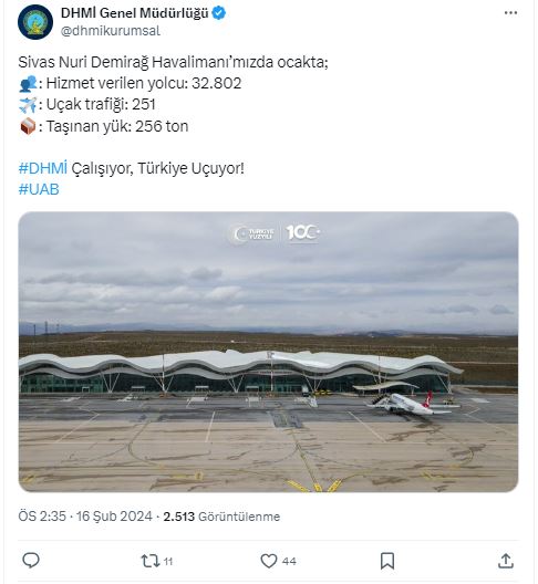 Devlet Hava Meydanları Genel Müdürlüğü sosyal medya hesabından Sivas Nuri Demirağ Havalimanı Ocak 2024 istatistiklerini paylaştı.