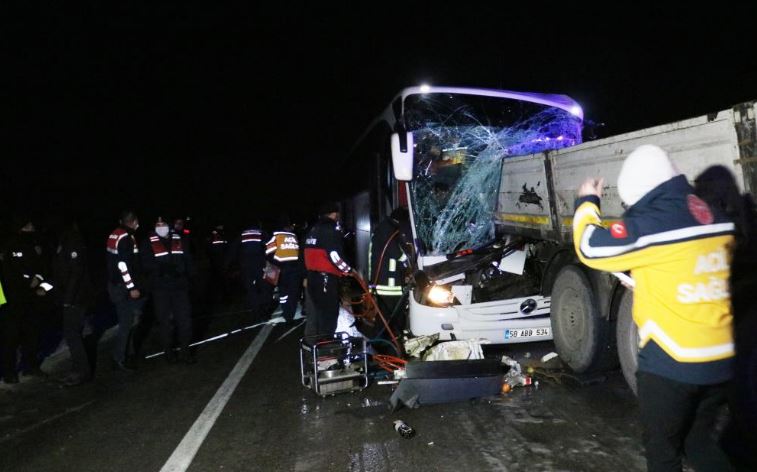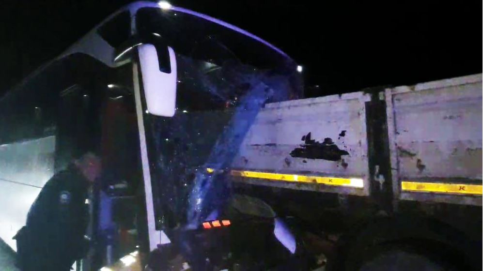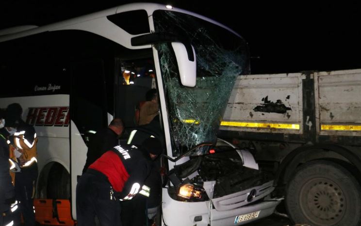 Buzlanan yolda duramayan yolcu otobüsü önündeki tıra çarptı. Tırın dorsesi otobüse saplandı, otobüs şoförü hayatını kaybetti.