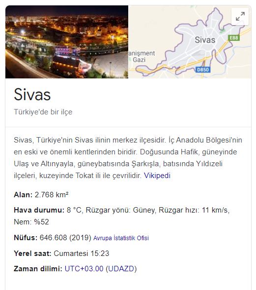 Dünyanın en büyük arama motoru Google'da "Sivas" araması yapıldığında aşağıdaki tanım çıkmakta! Ve bu tanımda Sivas "TÜRKİYE'NİN BİR İLÇESİ" olarak tanımlanmakta.