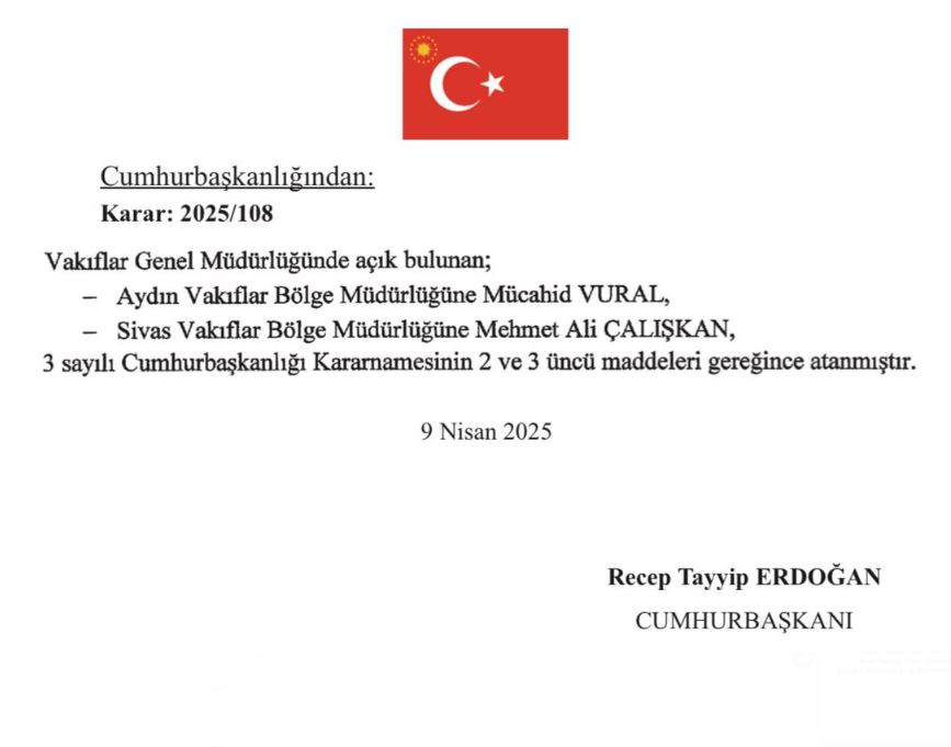 Bugün yayımlanan Resmi Gazete’de Cumhurbaşkanı Recep Tayyip Erdoğan’ın imzasıyla Sivas Vakıflar Bölge Müdürlüğü görevine Mehmet Ali Çalışkan atandı.