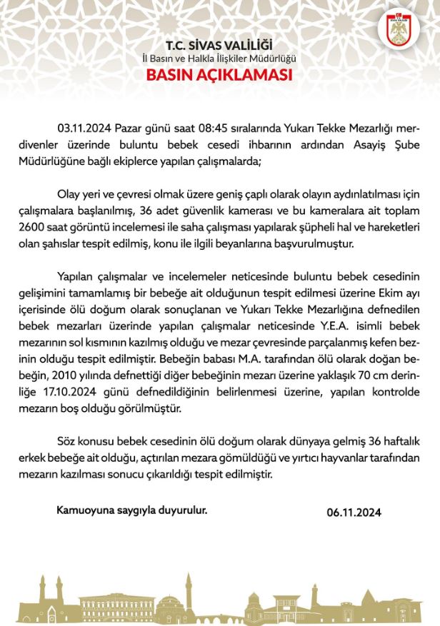 Sivas Valiliği sosyal medya hesabından Sivas'ta bulunan parçalanmış bebekle ilgili açıklama yaptı.