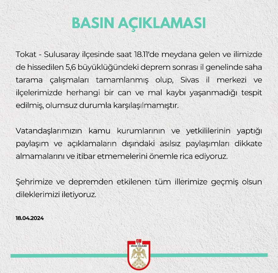 Sivas Valili yaşanan deprem sonrasında saha tarama çalışmalarının tamamlandığını açıkladı.