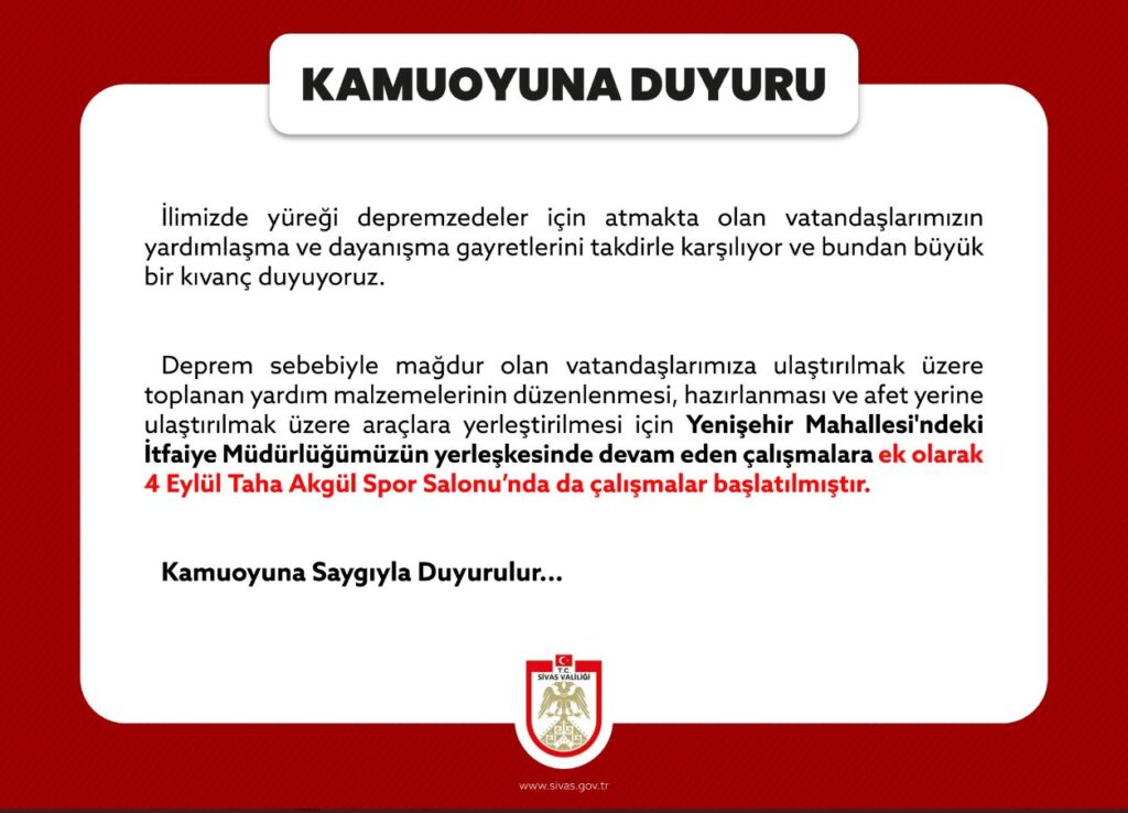 Sivas Valiliği Sivas'taki Yardım Toplama Merkezlerini Açıkladı!