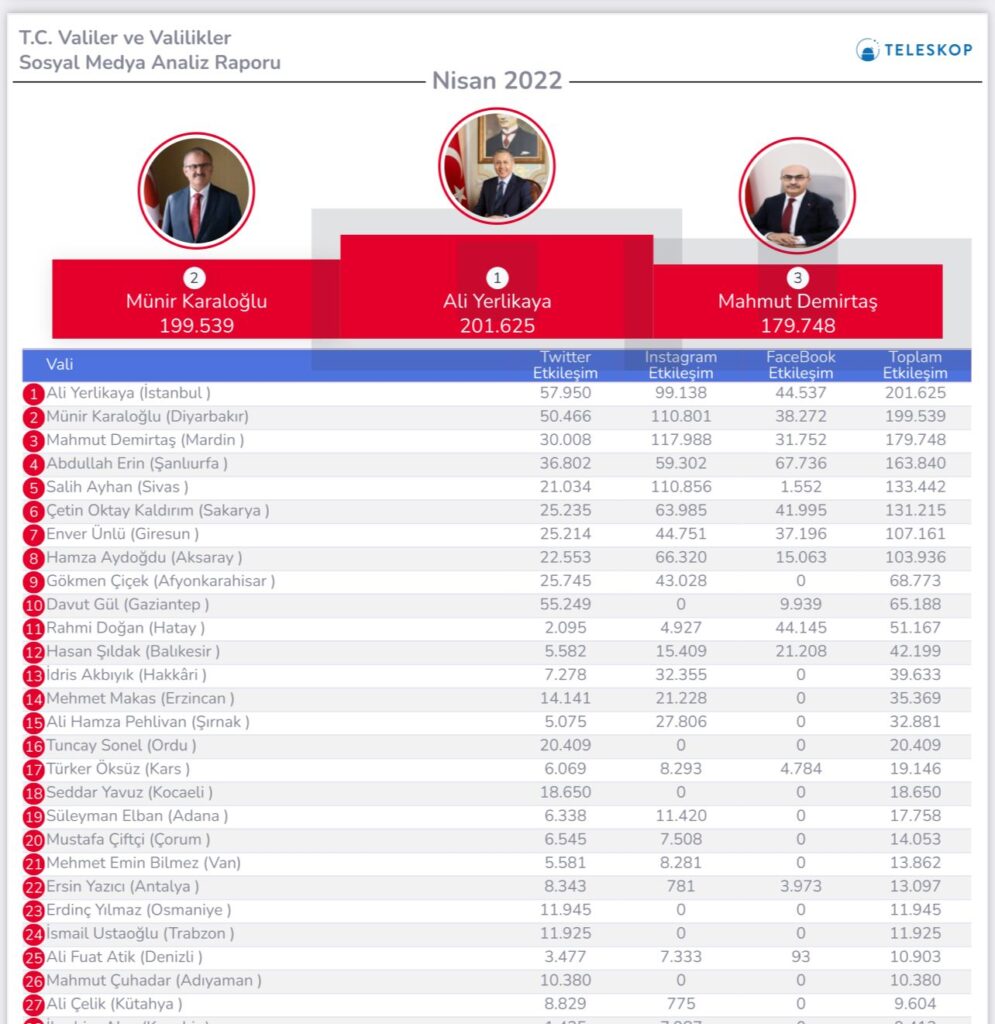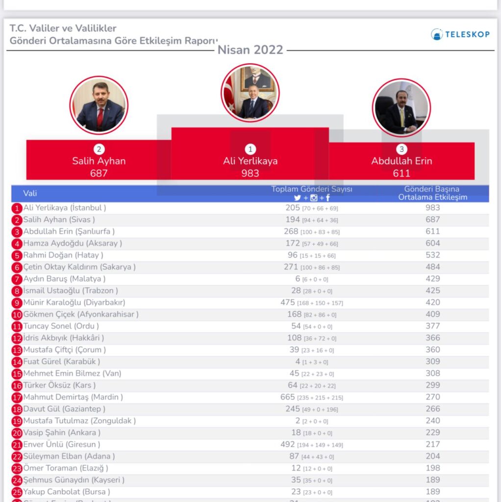 Nisan 2022 Teleskop APP raporuna göre, İstanbul Valisi Ali Yerlikaya, üç sosyal medya platformunda en fazla etkileşime sahip vali olarak yer aldı. Vali Yerlikaya'yı Diyarbakır Valisi Münir Karaloğlu, Mardin Valisi Mahmut Demirtaş, Şanlıurfa Valisi Abdullah Erin takip ederken, Sivas Valisi Salih Ayhan ise 5'inci sırda kendine yer buldu.