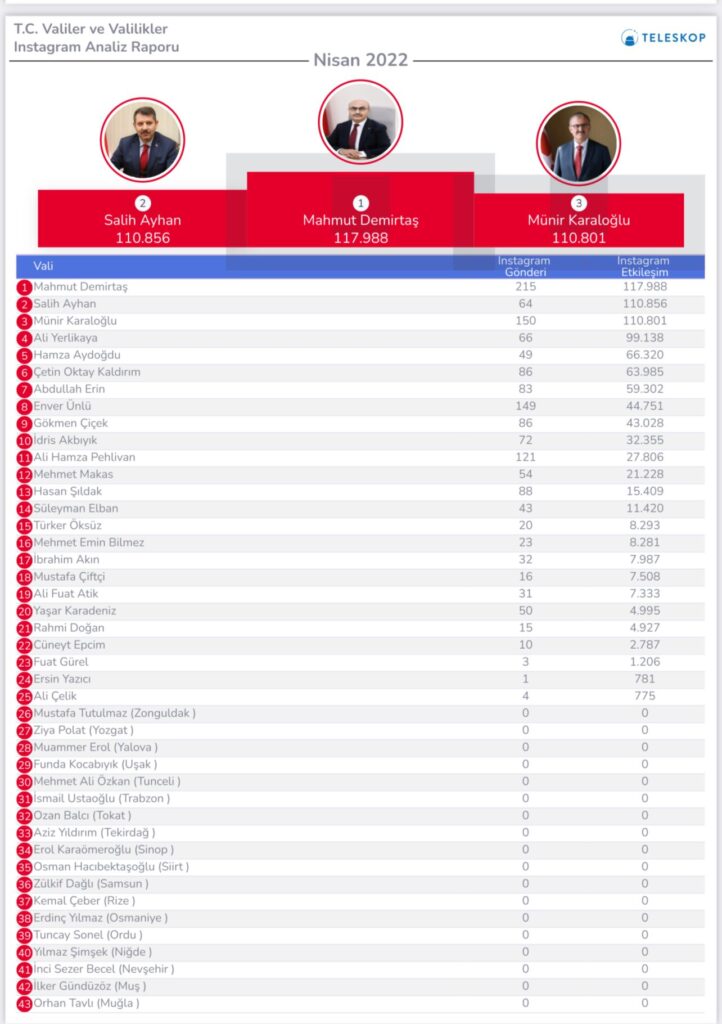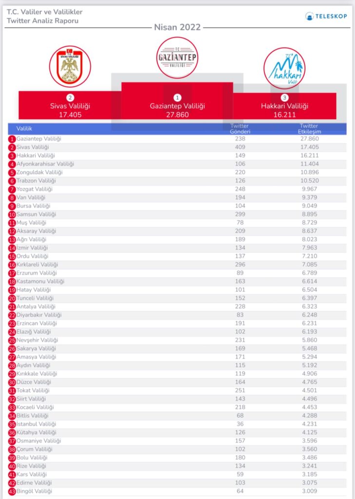 Teleskop APP, Valiler ve Valiliklerin 2022 Nisan Ayı Sosyal Medya Etkileşim Sonuçlarını paylaştı. Raporda, valiler ve valiliklerin Twitter, İnstagram, Facebook etkileşimleri yer aldı. Firma, raporu hazırlarken Twitter gönderilerinin beğeni, retweet, alıntı ve yorum, Facebook gönderilerinin beğeni, reaction, paylaşım ve yorum, İnstagram gönderilerinin beğeni ve yorum sayılarının toplamlarına göre çalışma gerçekleştirdi.