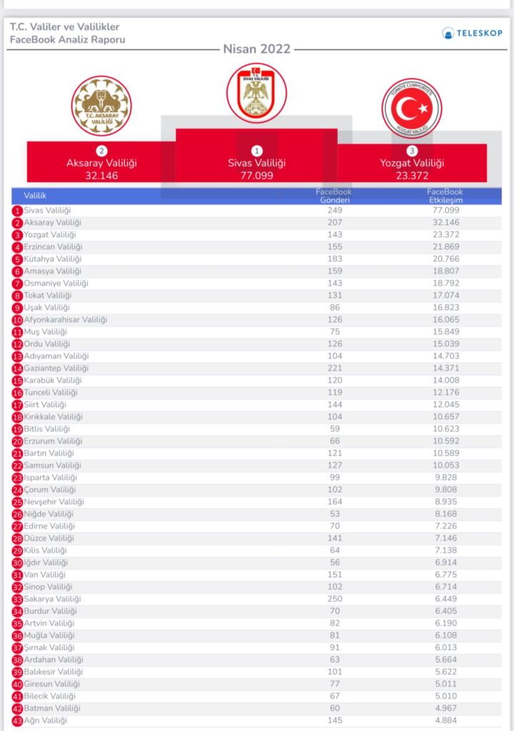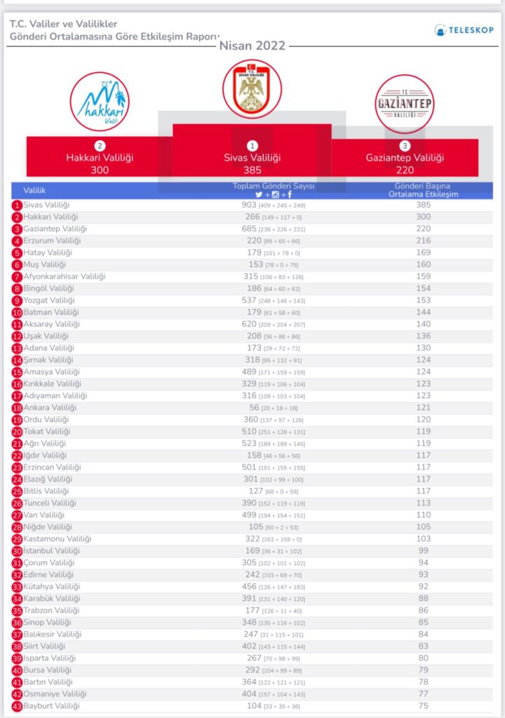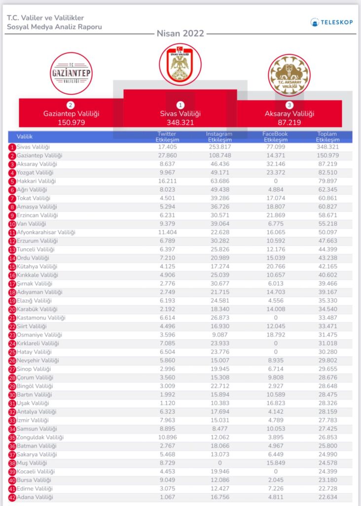 Teleskop APP tarafından paylaşılan valiliklerin sosyal medya etkileşim raporunda Sivas Valiliği ilk sırada, Gaziantep Valiliği ikinci, Aksaray Valiliği ise üçüncü sırada yer aldı. Valiliklerin sosyal medya analiz raporuna göre Sivas Valiliği’nin toplam etkileşimde açık ara önde olması da dikkatlerden kaçmadı.