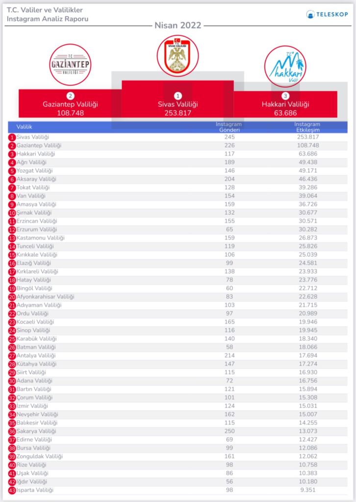 İnstagram Analiz Raporunda ise Sivas Valiliği uzak ara liderliği kimseye kaptırmayıp 1. sırada yer aldı. 2. Gaziantep Valiliği olurken 3. sırada ise Hakkâri Valiliği kendine yer buldu.