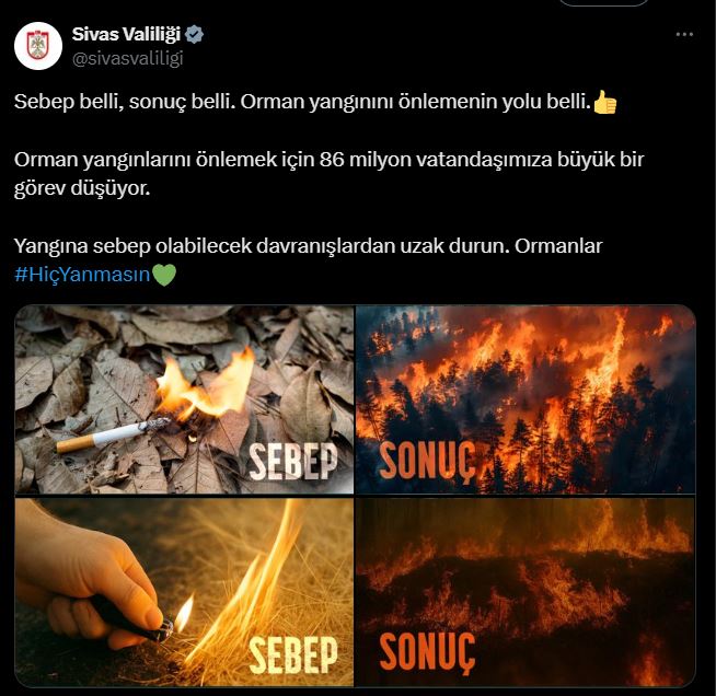 Sivas Valiliği, sosyal medya hesabından yaptığı paylaşımla vatandaşları orman yangınlarına karşı dikkatli olmaya çağırdı