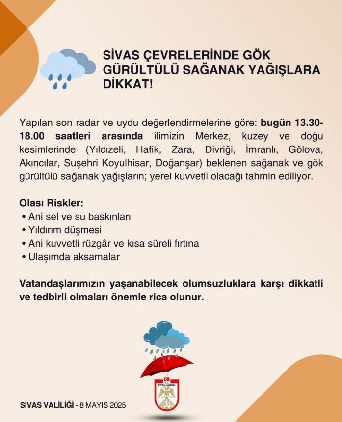 Valilik tarafından yapılan radar ve uydu değerlendirmelerine göre, Yıldızeli, Hafik, Zara, Divriği, İmranlı, Gölova, Akıncılar, Suşehri, Koyulhisar ve Doğanşar ilçelerinde ani hava olayları görülebilir.