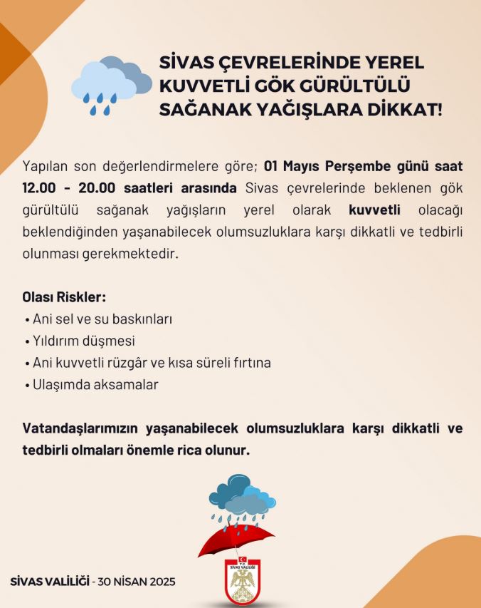 Sivas Valiliği, 1 Mayıs Perşembe günü için kuvvetli gök gürültülü sağanak yağış uyarısında bulundu.