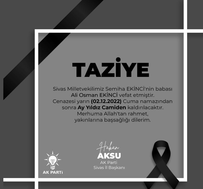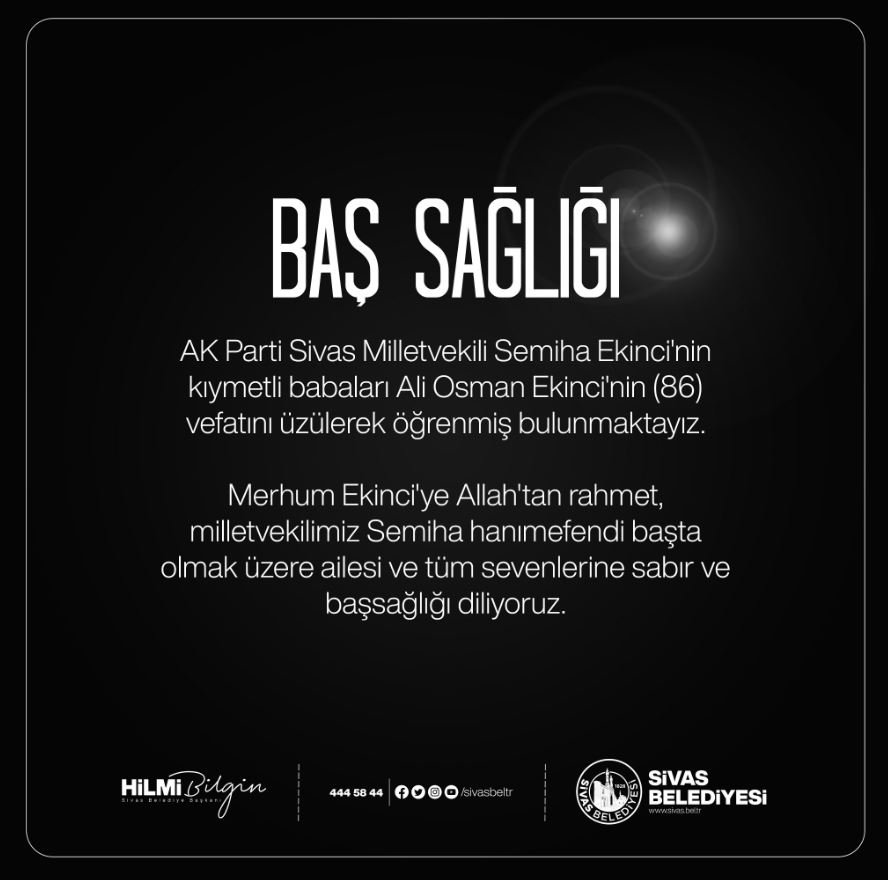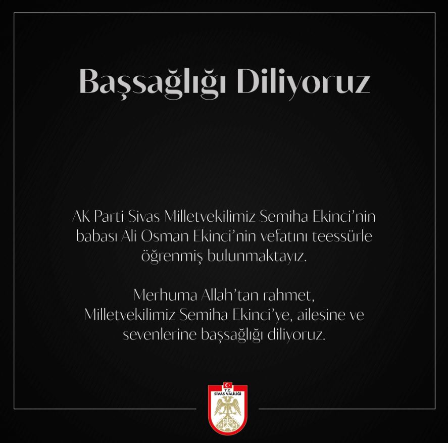 Bizde Büyük Sivas Medya Grubu olarak dar-ı bekaya irtihal eden merhuma Allah'tan rahmet, AK Parti Sivas Milletvekili Semiha Ekinci ve yakınlarına başsağlığı diliyoruz.