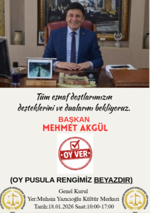 AKgül Başkan BEYAZ.. Sivas Yiyecek Maddeleri Yapanlar ve Satanlar Meslek Odası’nın olağan seçimli genel kurulu, 18 Ocak 2026 tarihinde Muhsin Yazıcıoğlu Kültür Merkezi’nde gerçekleştirilecek.
