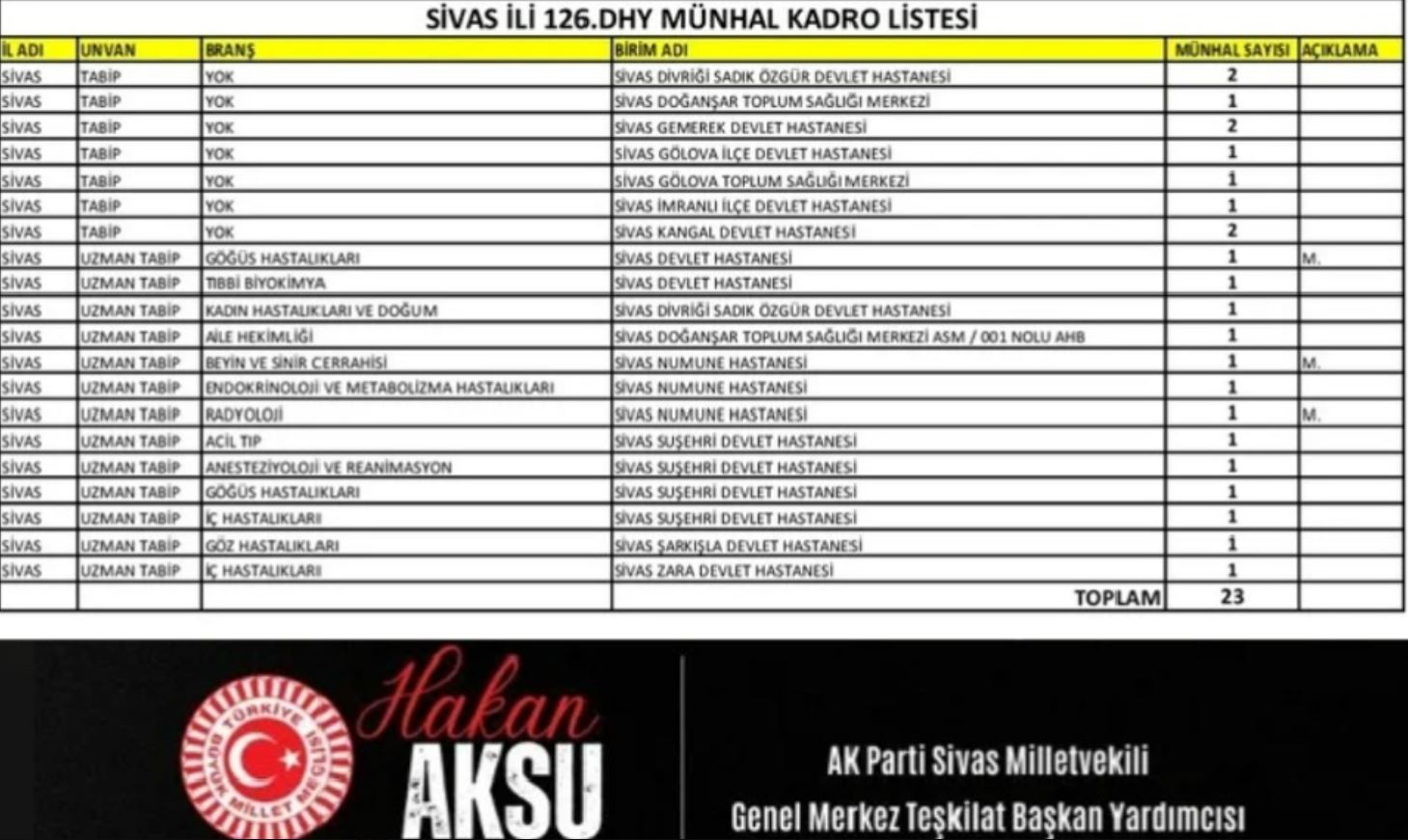 Sivas’a 23 yeni hekim ve uzman hekim kadrosu.. AK Parti Sivas Milletvekili Hakan Aksu, Sivas’ta sağlık hizmetlerini güçlendirecek yeni hekim kadrolarının tahsis edildiğini duyurdu. Aksu, müjdeyi sosyal medya hesabından yaptığı paylaşımla kamuoyuyla paylaştı.