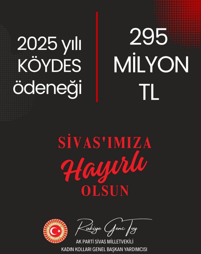 AK Parti Sivas Milletvekili ve Kadın Kolları Genel Başkan Yardımcısı Rukiye Toy, sosyal medya hesabından yaptığı açıklamada, 2025 yılı KÖYDES ödenekleri kapsamında Sivas’a 295 milyon TL kaynak tahsis edildiğini duyurdu.