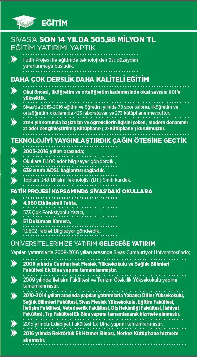 Bu yatırımlar içinde ise Sivas’a eğitim alanında toplam 505,98 TL yatırım yapıldı.