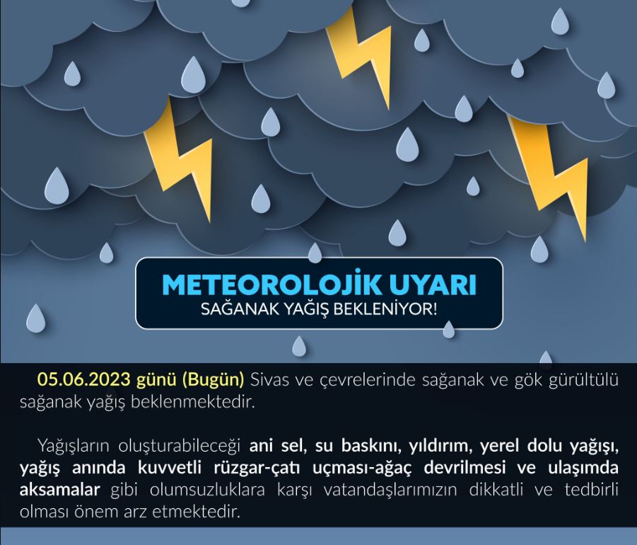 Meteoroloji Genel Müdürlüğünden yapılan açıklamada: "05.06.2023 günü Sivas ve çevrelerinde sağanak ve gök gürültülü sağanak yağış beklenmektedir." ifadelerine yer verildi. (Devrim Esra Dündar)