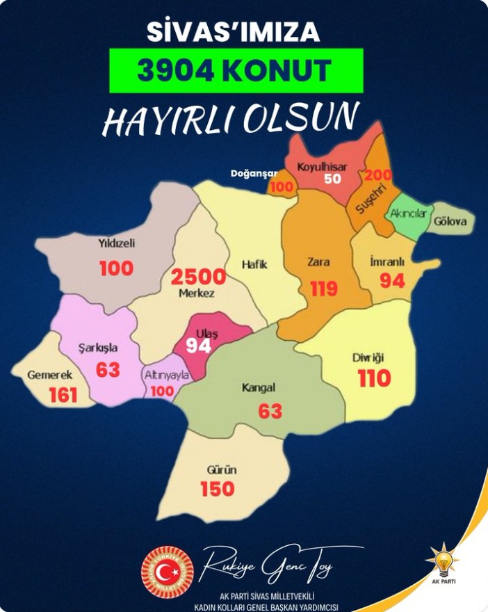 AK Parti Sivas Milletvekili Rukiye Genç Toy, sosyal medya hesabından yaptığı paylaşımda, “Yüzyılın Konut Projesi” kapsamında Sivas’a toplam 3 bin 904 sosyal konut kazandırılacağını duyurdu.