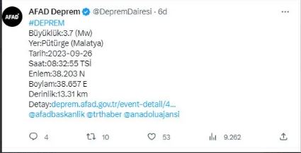 Malatya'nın Pütürge ilçesinde 3.7 büyüklüğünde bir deprem meydana geldi.