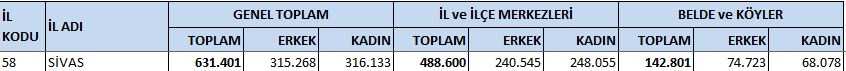 Açıklanan verilere göre Sivas’ın toplam nüfusu 631 bin 401 olarak kaydedildi. Bu nüfusun 315 bin 268’ini erkekler, 316 bin 133’ünü ise kadınlar oluşturdu.