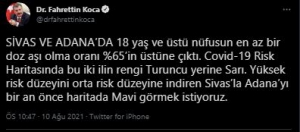 "SİVAS VE ADANA’DA 18 yaş ve üstü nüfusun en az bir doz aşı olma oranı %65’in üstüne çıktı. Covid-19 Risk Haritasında bu iki ilin rengi Turuncu yerine Sarı. Yüksek risk düzeyini orta risk düzeyine indiren Sivas’la Adana’yı bir an önce haritada Mavi görmek istiyoruz."