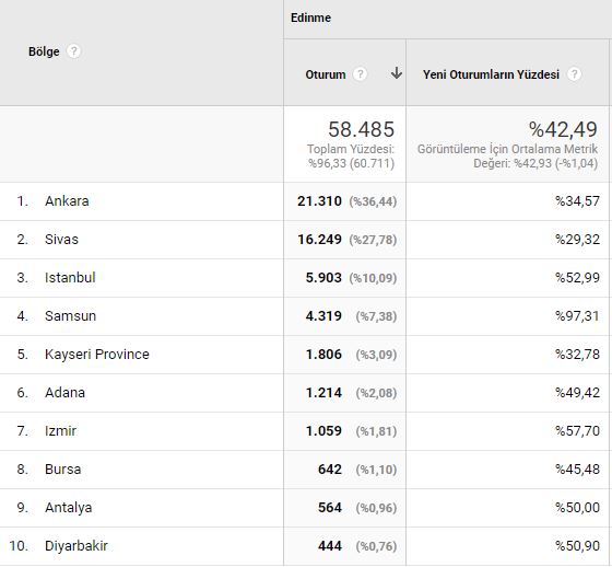 Sivas'tan buyuksivas.com'u takip edenlerden daha yüksek oranda Ankara'dan takip edilen portalımızı, İstanbul, Samsun, Kayseri, Adana, İzmir, Bursa, Antalya vb. illerde yoğun olarak takip ediyor.