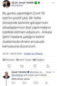 Bu günkü yaptırdığım Covit 19 test’im pozitif çıktı. Bir hafta öncesinde benimle görüşen tüm arkadaşlarımızın test yaptırmalarını özellikle istirham ediyorum . Ankara Şehir Hastane yattığımı belirtir dualarınızda olmam arzusuyla kamuoyuna duyururum"