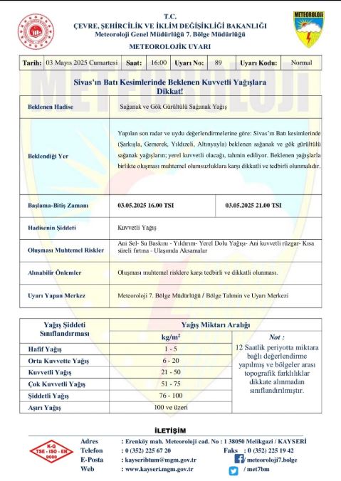 Meteoroloji 7. Bölge Müdürlüğü tarafından yapılan açıklamaya göre, 3 Mayıs 2025 Cumartesi günü Sivas’ın batı kesimlerinde kuvvetli sağanak ve gök gürültülü sağanak yağış bekleniyor.