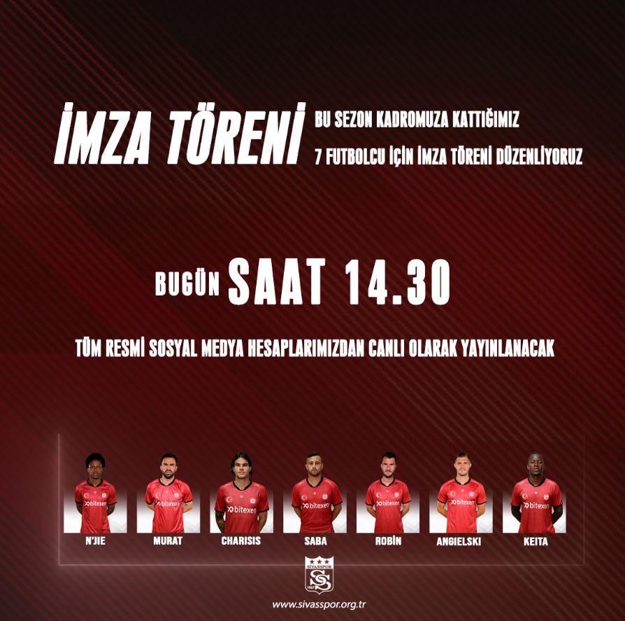 Yapılan açıklamada: "Bu sezon kadromuza kattığımız 7 futbolcu için imza töreni düzenliyoruz.Bugün saat 14.30'da gerçekleştirilecek imza töreni kulübümüzün sosyal medya hesaplarından canlı olarak yayınlanacak.