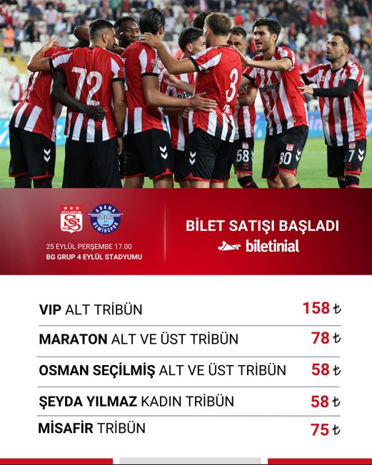 Özbelsan Sivasspor ile Adana Demirspor arasında oynanacak Trendyol 1. Lig 2025-2026 sezonu 7. hafta karşılaşmasının biletleri satışa sunuldu.