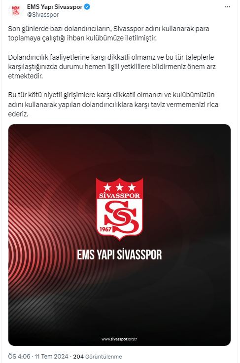 Kulüp yetkilileri, Sivasspor adının kötüye kullanıldığına dair gelen ihbarların ardından bir açıklama yaparak, taraftarları ve destekçileri bu tür kötü niyetli girişimlere karşı uyanık olmaya çağırdı. Açıklamada, "Kulübümüzün adını kullanarak yapılan her türlü dolandırıcılık girişimine karşı dikkatli olmanız ve karşılaştığınız durumu hemen ilgili yetkililere bildirmeniz büyük önem taşımaktadır," ifadeleri kullanıldı.