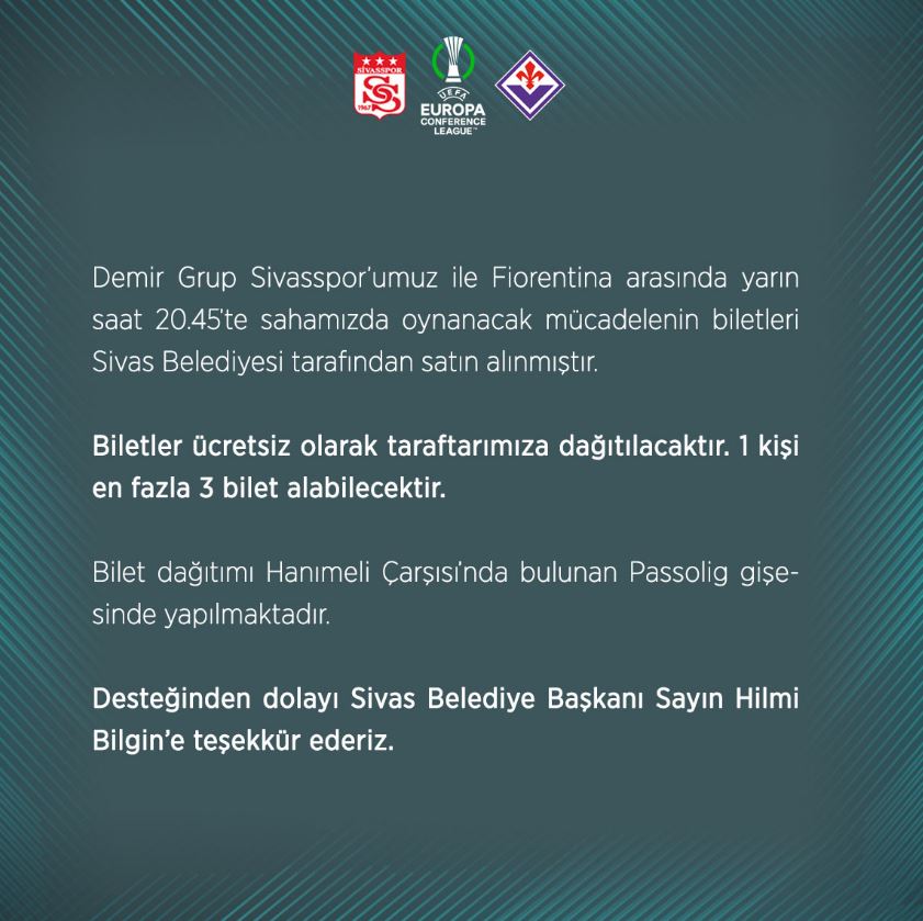 Sivasspor tarafından yapılan açıklamada :"Demir Grup Sivasspor’umuz ile Fiorentina arasında yarın saat 20.45’te sahamızda oynanacak mücadelenin biletleri Sivas Belediyesi tarafından satın alınmıştır.