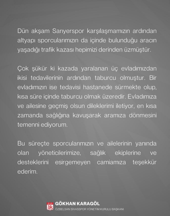 Özbelsan Sivasspor Başkanı Gökhan Karagöl, Sarıyerspor karşılaşmasının ardından altyapı sporcularının da içinde bulunduğu aracın karıştığı trafik kazasıyla ilgili açıklama yaptı.