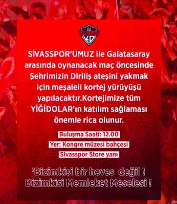 Sivasspor yönetimi ve taraftar grupları tarafından organize edilen etkinlik için tüm Yiğidoların katılımı önemle rica ediliyor. Kortej, 10 Aralık Pazar günü saat 12.00’de başlayacak. Taraftarlar, Kongre Müzesi bahçesinde, Sivasspor Store yanında toplanarak şehirde birlik ve beraberliği gösterecek.