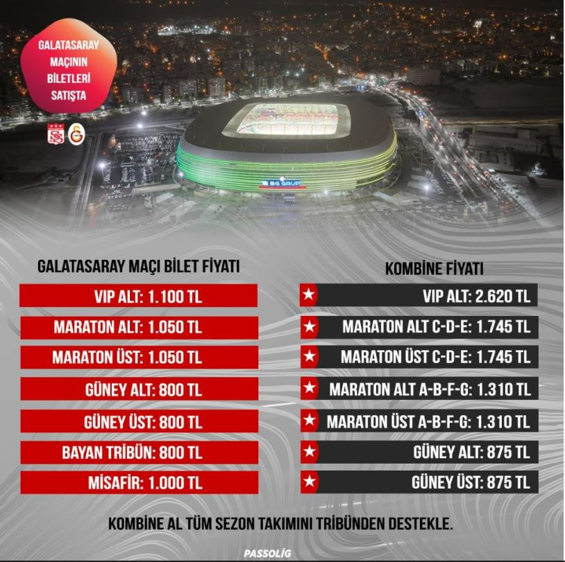 Sivasspor ile Galatasaray arasında 16 Aralık Cumartesi günü saat 19.00'da Sivas 4 Eylül Stadyumu'nda oynanacak karşılaşmanın bilet fiyatları şöyle: