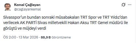 Çağlayan paylaşımında, “Sivasspor’un bundan sonraki müsabakaları TRT Spor ve TRT Yıldız’dan verilecek. AK Parti Sivas Milletvekili Hakan Aksu, TRT Genel Müdürü ile görüştü ve müjdeyi verdi” ifadelerine yer verdi.