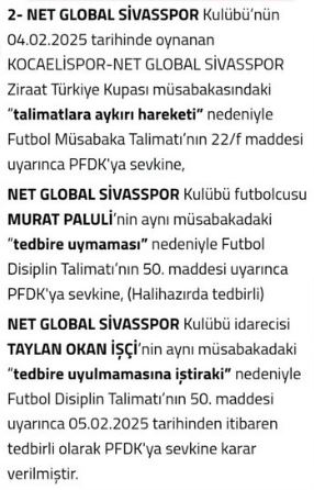 Net Global Sivasspor, 04.02.2025 tarihinde oynanan Kocaelispor-Net Global Sivasspor Ziraat Türkiye Kupası müsabakası sonrasında "talimatlara aykırı hareket" gerekçesiyle Futbol Müsabaka Talimatı’nın 22/f maddesi uyarınca Profesyonel Futbol Disiplin Kurulu’na (PFDK) sevk edildi.
